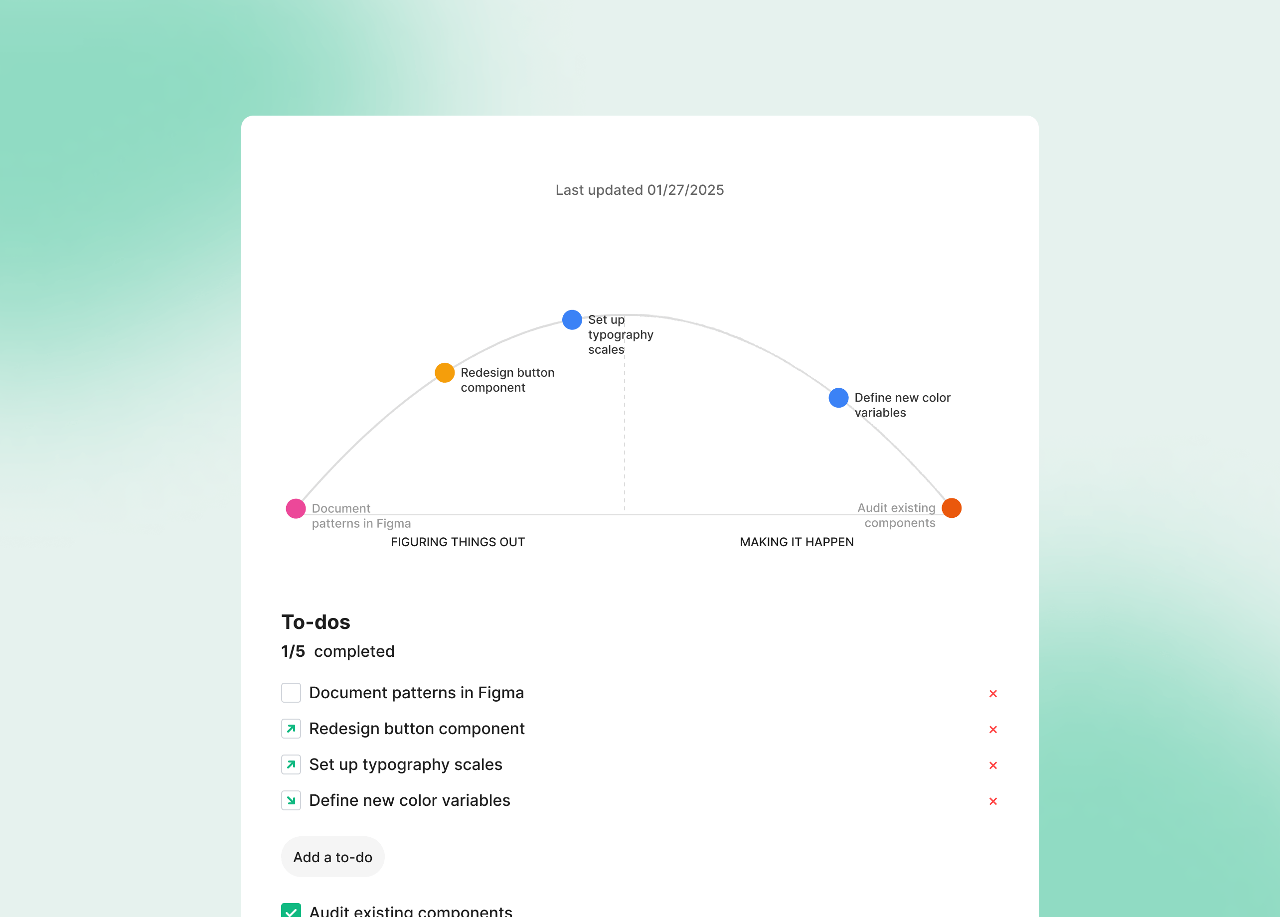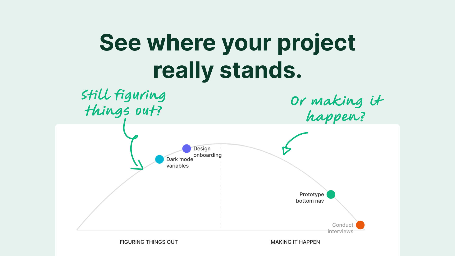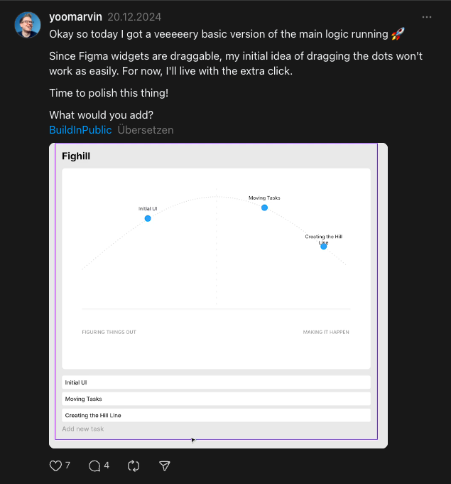 The intended interaction was obvious: drag tasks along a hill curve to show progress. But Figma's widget API doesn't expose drag events. I had to rethink the core interaction model entirely. The solution was an Edit Mode with a slider — less visceral than dragging, but it turned out to be more precise and worked better for teams updating multiple tasks at once. Sometimes a constraint produces a better outcome than the original idea.