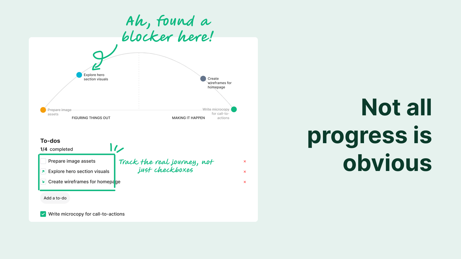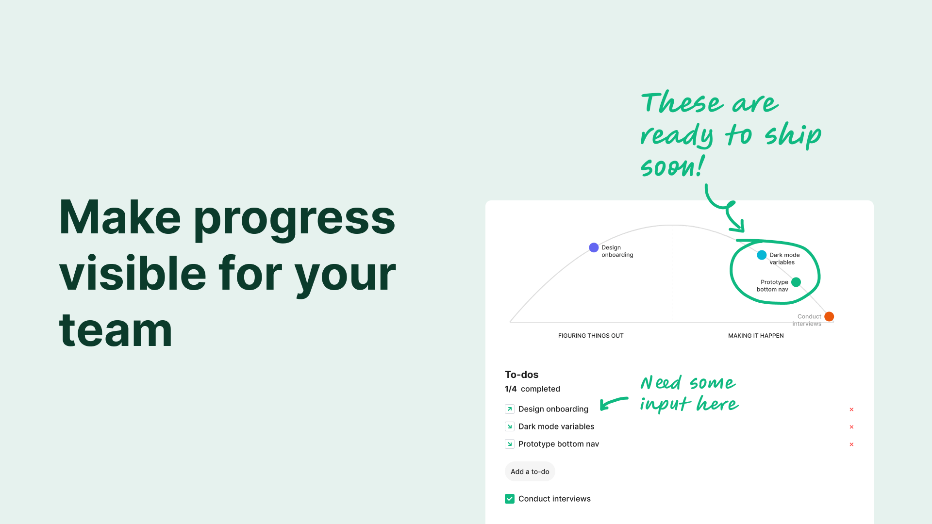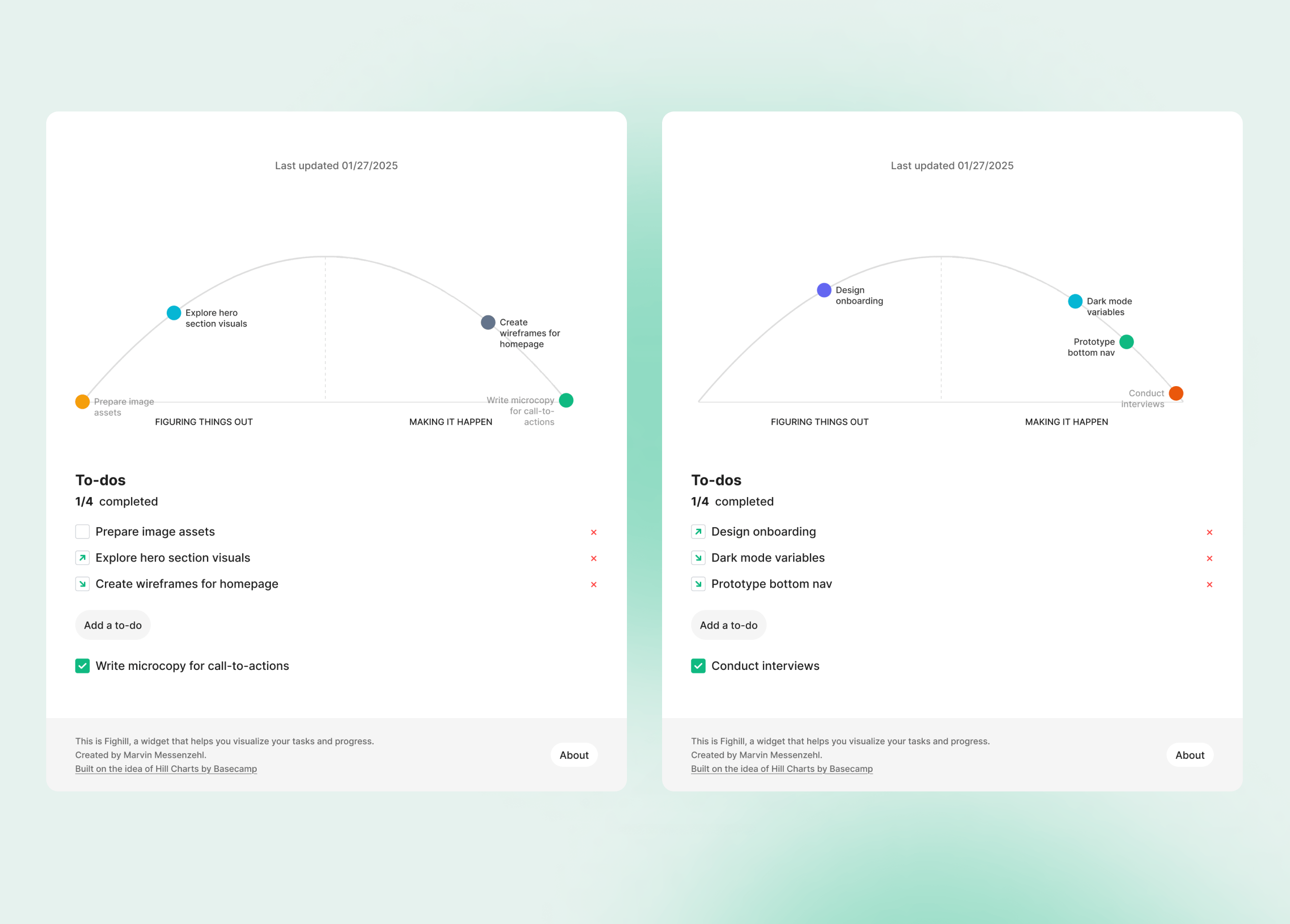 The intended interaction was obvious: drag tasks along a hill curve to show progress. But Figma's widget API doesn't expose drag events. I had to rethink the core interaction model entirely. The solution was an Edit Mode with a slider — less visceral than dragging, but it turned out to be more precise and worked better for teams updating multiple tasks at once. Sometimes a constraint produces a better outcome than the original idea.