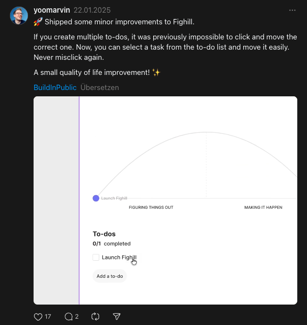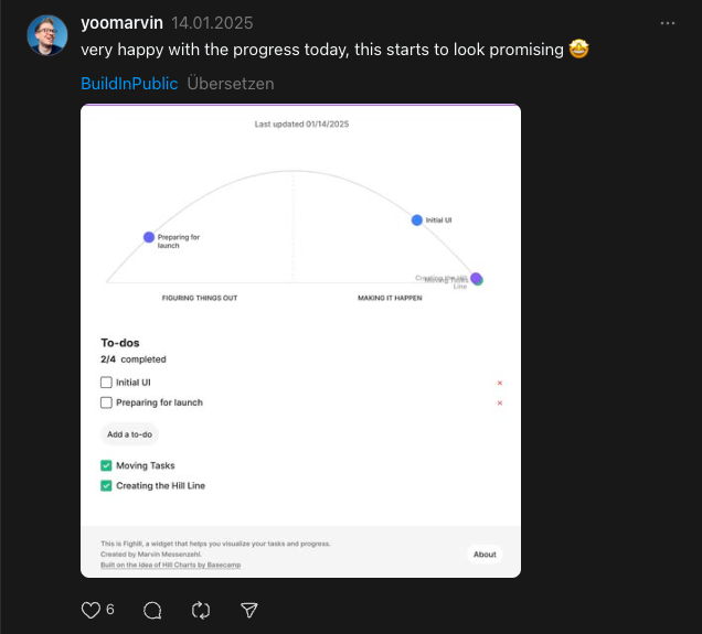 I built the first working version in two evening coding sessions. I shipped publicly at the end of January 2025 after building in the open on Threads and LinkedIn, collecting feedback throughout. The widget hit 1,000 users in three weeks. It's been iterated on continuously since — task editing, color customization, improved add flow — all driven by direct user feedback.