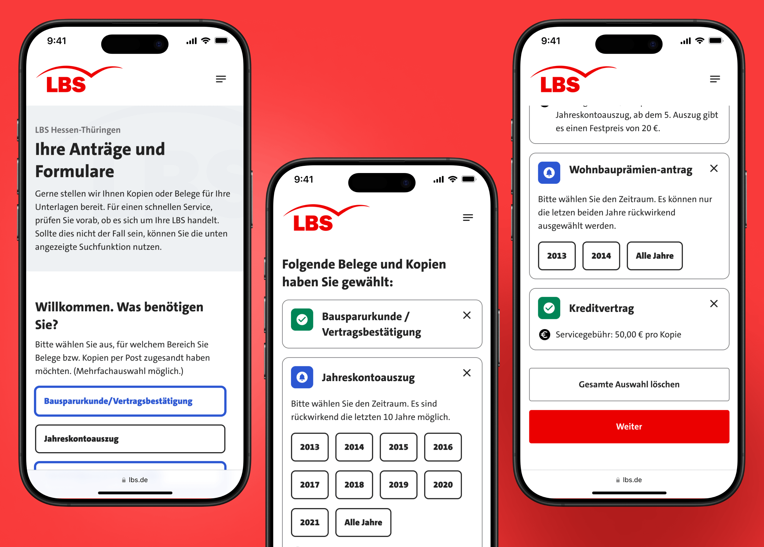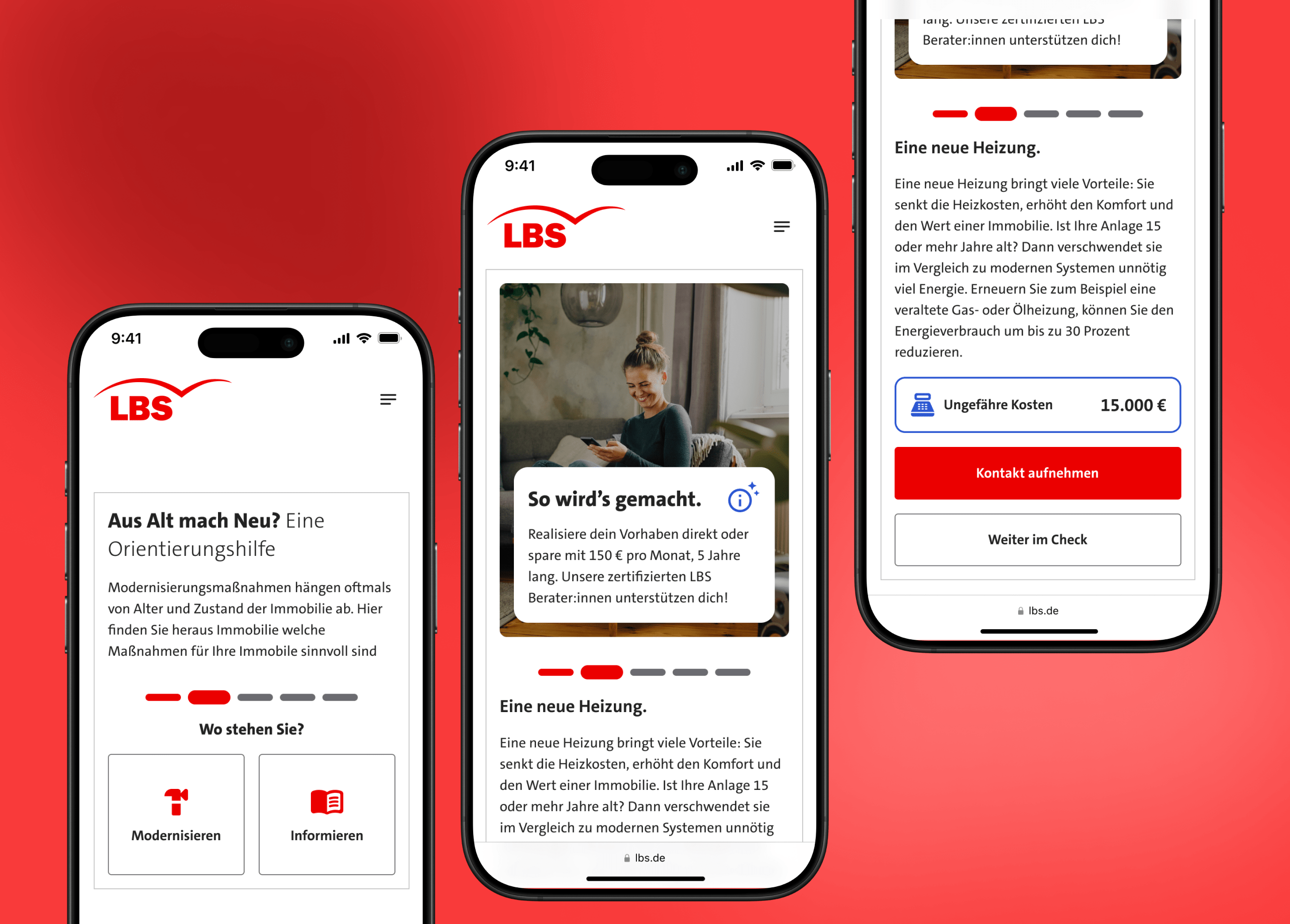 The constraint was financial services: every number had to be legally accurate, every flow accessible, and the users had zero financial background. I designed and built step-by-step decision tools in React and Tailwind that made legally complex processes feel navigable. The relaunch shipped on lbs.de. I delivered UX/UI design, React implementation, and event tracking integration across the full interactive layer.