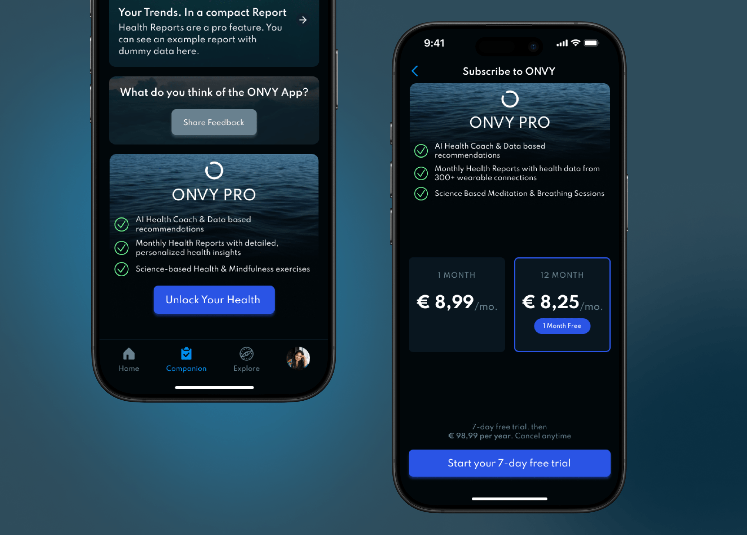 ONVY is a Munich health-tech startup building an AI-driven wellness app. I joined the founding team before launch and stayed through the first major growth phase, contributing across product design and React Native development.