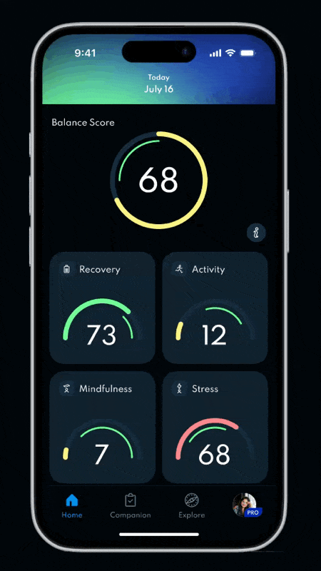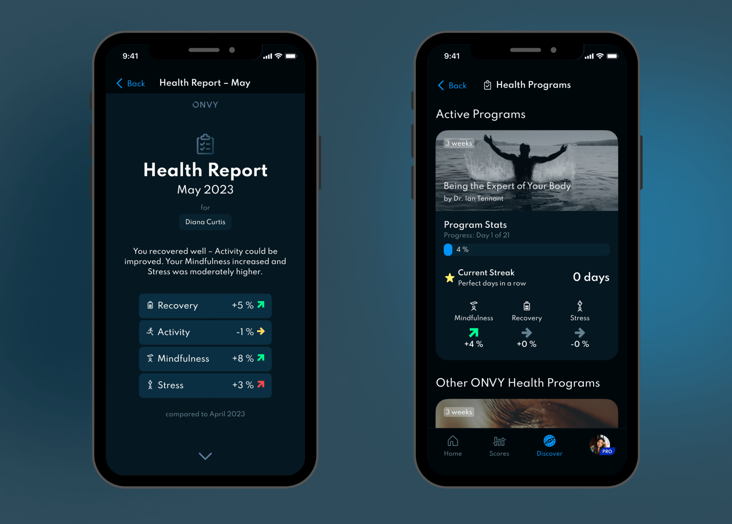 The most concrete thing I built: ONVY's first payment and subscription flow, designed and implemented in React Native end-to-end. I also designed the AI health report system and the B2B program model that became one of their two primary revenue streams. The harder design challenge was making complex biometric data — recovery scores, stress indices, activity patterns — feel personal rather than clinical.